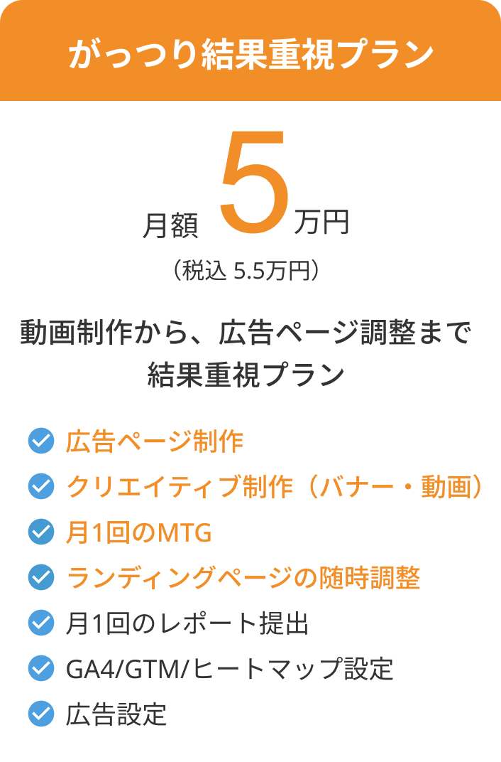 一般的には広告費に対して20%が運用費。最低広告費が30万などの企業様が多いです。しかしそれだと、これからテスト的に初めて見たい方にはハードルが高い為、できる限り広告運用費を抑えて色々な方に体験をして頂きたいと考え、格安プランを作成しております。その為、コンサルタントのような毎月の細かなレポーティングや毎週MTGなどを極力減らし、ご提供できるサービスといたしました。