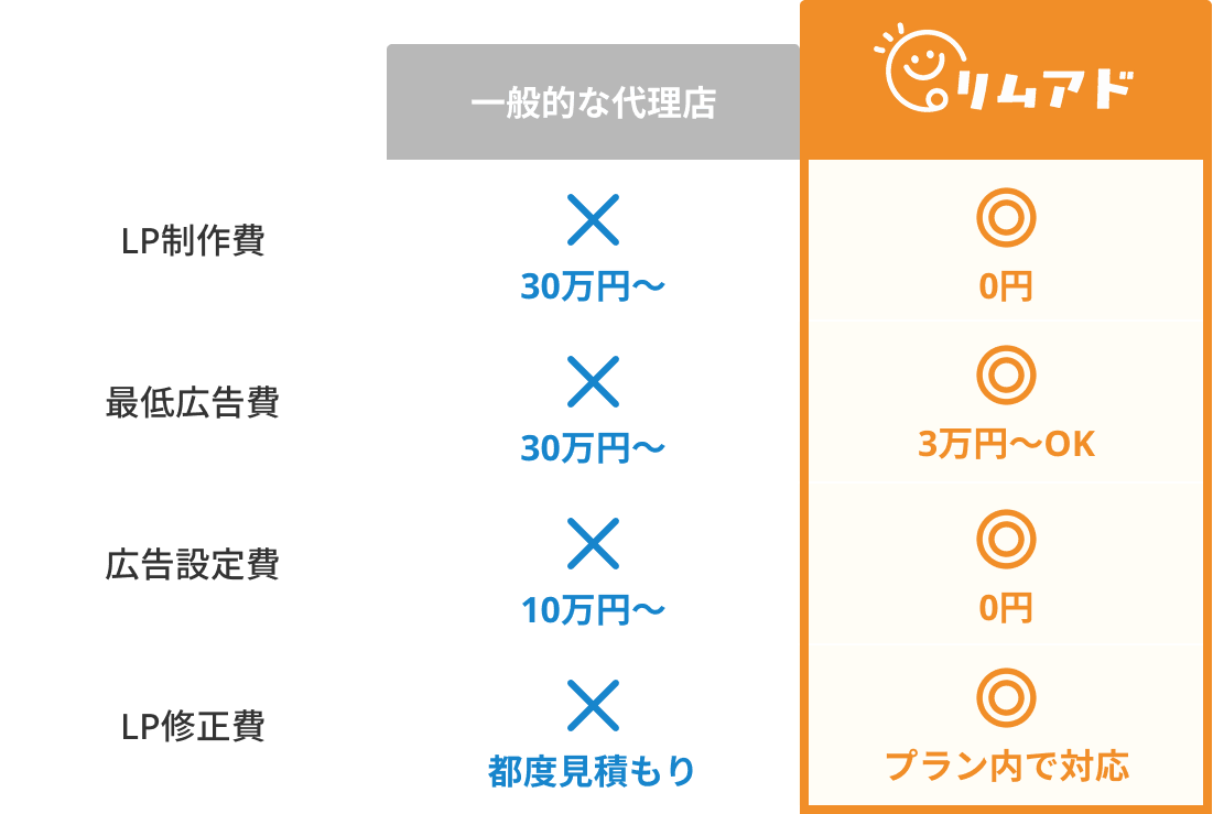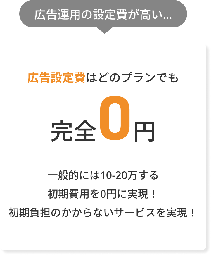 一般的には、初期設定費用は10-20万となります。広告ページへのタグ埋め込み、計測器の設定、広告媒体の設定など各対応が多い為です。しかし弊社の場合は、1人でも多くの方に広告集客を試したいただきたい!と考え、初期費用を0円でご提供させていただいております。