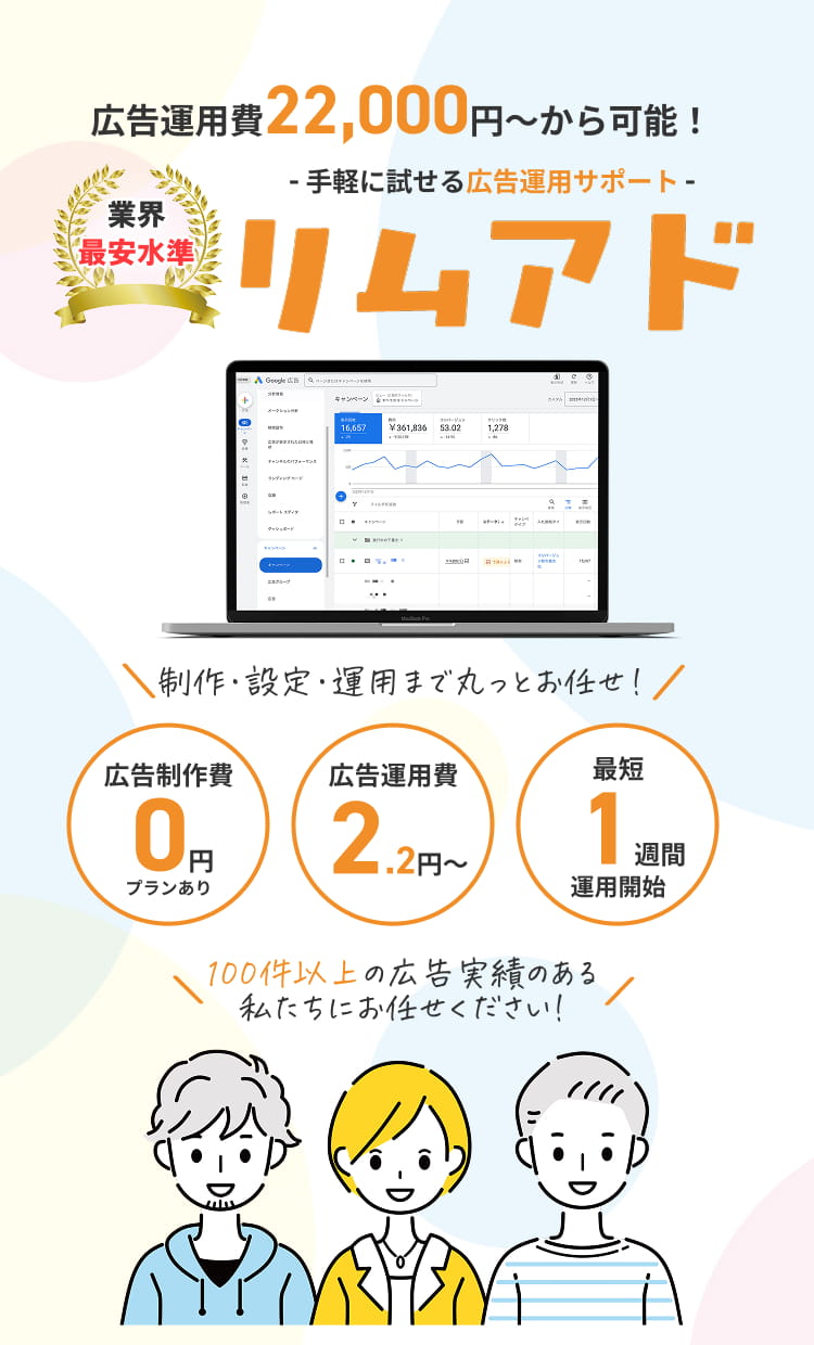一般的には、20%の広告運用費・毎月30万以上の広告費を出せるクライアント様しか受け付けない代理店が多いです。それは、20%が相場であり、また広告費用が低い場合結果も出しづらく、また運用フィーも少なくなる為お断りするケースとなります。弊社の場合は、お手軽に試せる2.2万〜のプランもご用意しており、「せっかくだしやってみよう」と言ってくれる方が非常に多いのが特徴です。